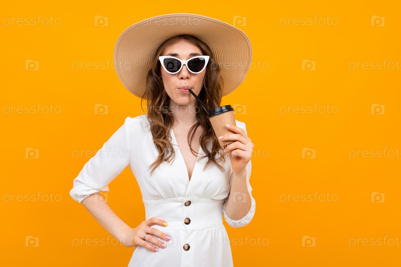 Девушка, одетая в белое платье со шляпой в очках, пьет напиток на желтом фоне