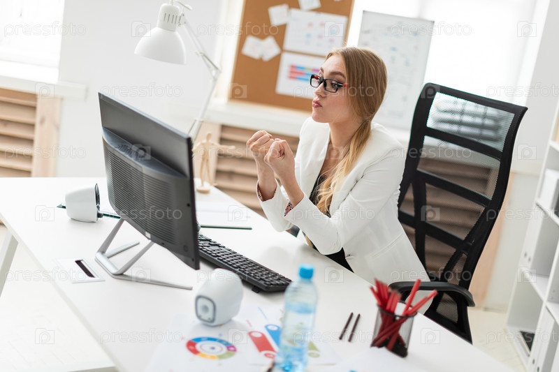 Молодая девушка сидит за столом в офисе, смотрит на монитор и показывает два кулака