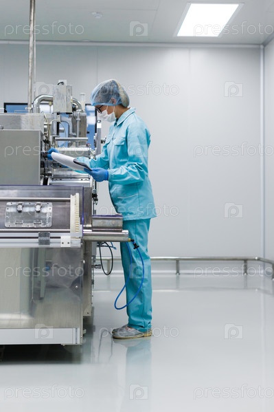 Ученый в медицинском костюме, работающий с машиной
