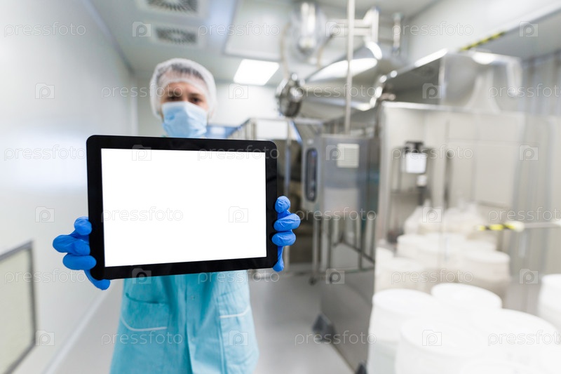 Планшет спереди, фокус на планшете, медицинский работник в синем костюме показывает пустой планшет