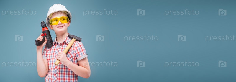 Уверенный молодой строитель европейского вида в строительном шлеме и очках, держащий в руках профессиональный строительный инструмент, студийный портрет на талии на серо-голубом фоне, фото с местом для текста