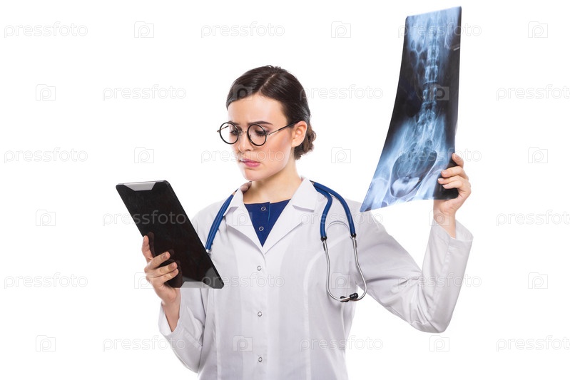Портрет молодой привлекательной женщины-врача в белом халате, смотрящей в рентгеновский снимок, ставящей диагноз, анализирующей озадаченный, сбитый с толку, думающий, неопытный, разочарованный, позитивный, веселый, забавный, брюнет, кавказский, красивый,