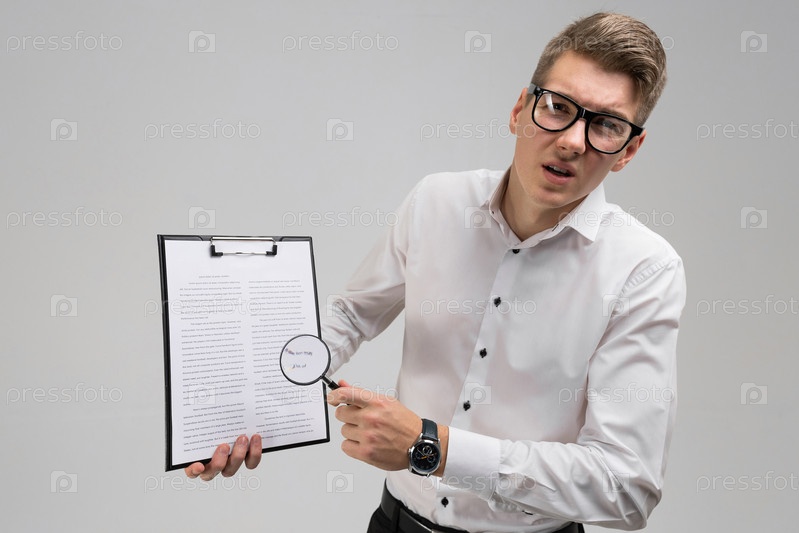 Красивый мужчина в белой рубашке держит в руках страховой лист и увеличительное стекло. страховой агент один в студии. место для этикетки