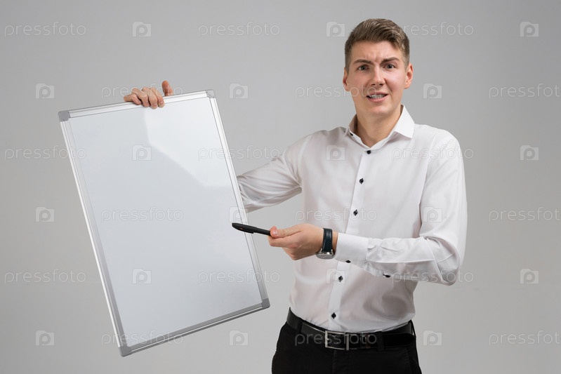 Портрет молодого человека с чистой магнитной доской и маркером в руках на белом фоне