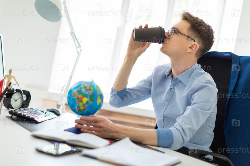В офисе работает красивый молодой человек в очках, синих брюках и светлой рубашке. На спинке стула висит его куртка. фото с глубиной резкости
