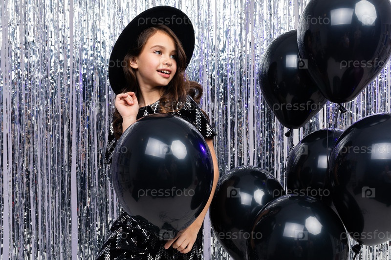 девочка-подросток на праздновании дня рождения на фоне черных гелиевых шаров и мишуры