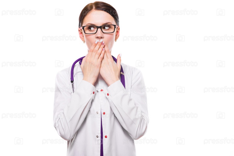 Молодая красивая женщина-врач закрывает уши руками, так как нуждается в молчании медицинской тайной концепции на белом фоне