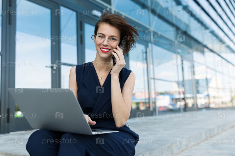 Привлекательная деловая женщина, сидящая на ступеньках во время обеденного перерыва с телефоном в руках и ноутбуком на коленях на фоне бизнес-центра