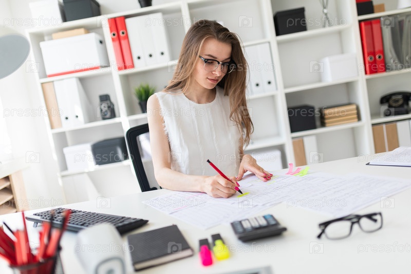 Красивая молодая девушка сидит за столом в офисе, держит в руке ручку и заполняет документы