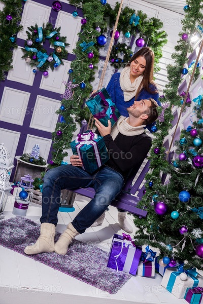 Влюбленная пара на белой террасе сидит на качелях рядом с Ч