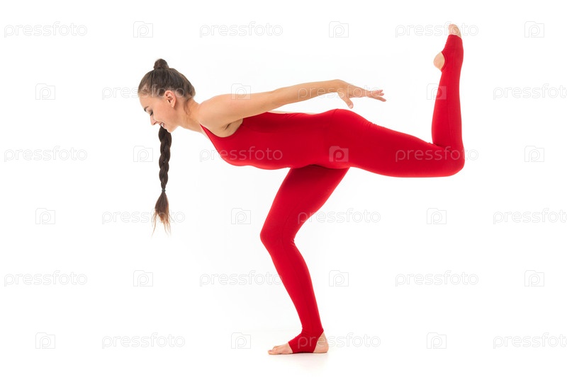 Красивая молодая гимнастка делает разминку и растягивает мышцы