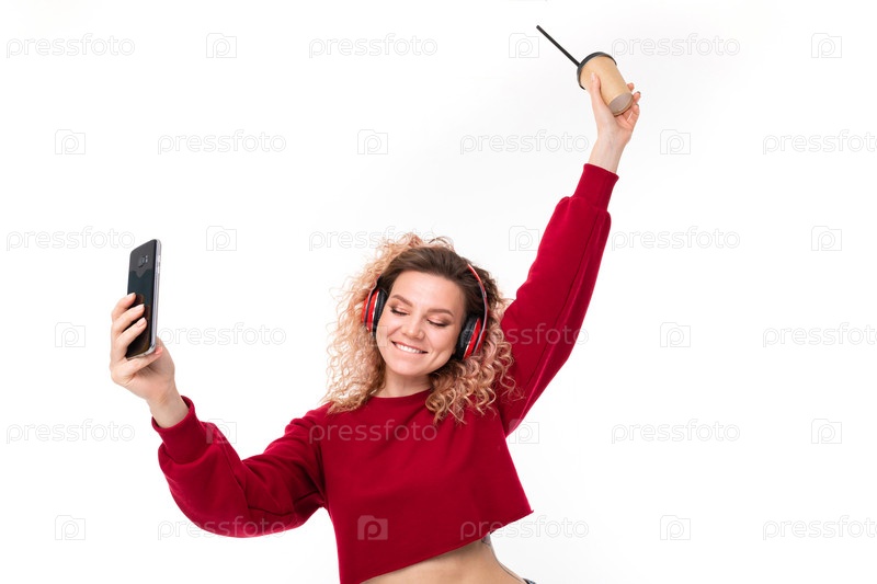 Красивая кавказская женщина с вьющимися светлыми волосами пьет кофе и делает селфи