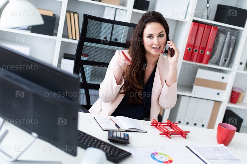 Молодая девушка сидит за старым компьютером, разговаривает по телефону и держит красный карандаш