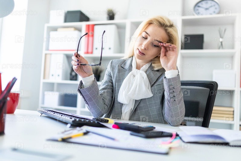 Молодая девушка сидит за столом в офисе. Девушка сняла очки и приложила руку ко лбу