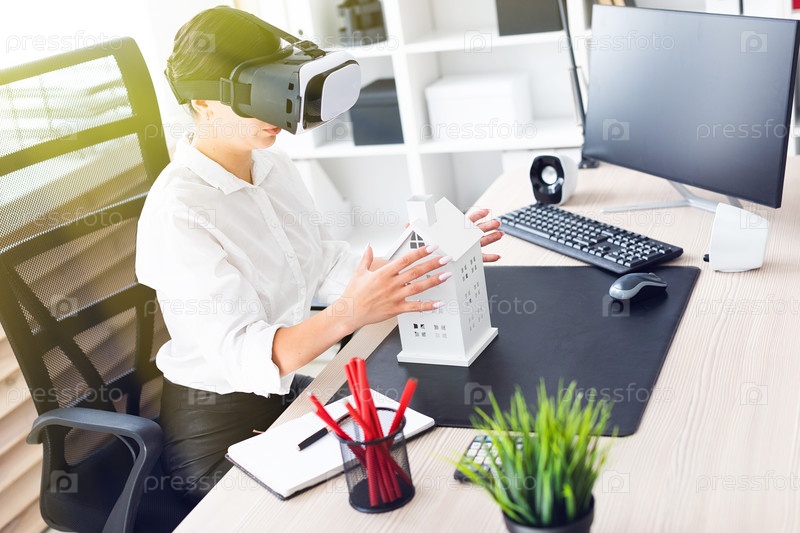 Молодая девушка сидит в очках виртуальной реальности. Перед ней на столе план дома