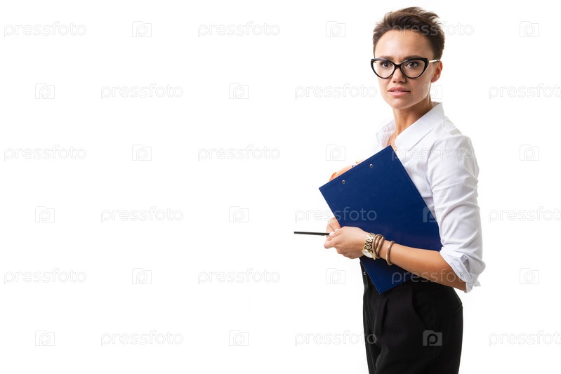 Красивая кавказская женщина в офисной одежде думает о работе и держит блокнот на белом фоне