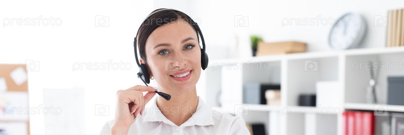 Молодая девушка в наушниках с микрофоном в ярком офисе