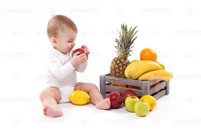 Глядя на фрукты милый улыбающийся ребенок на белом фоне среди фруктов