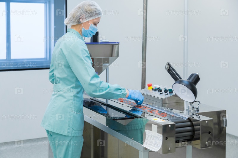 Фармацевт в стерильной среде работает над производством таблеток на аптечном заводе