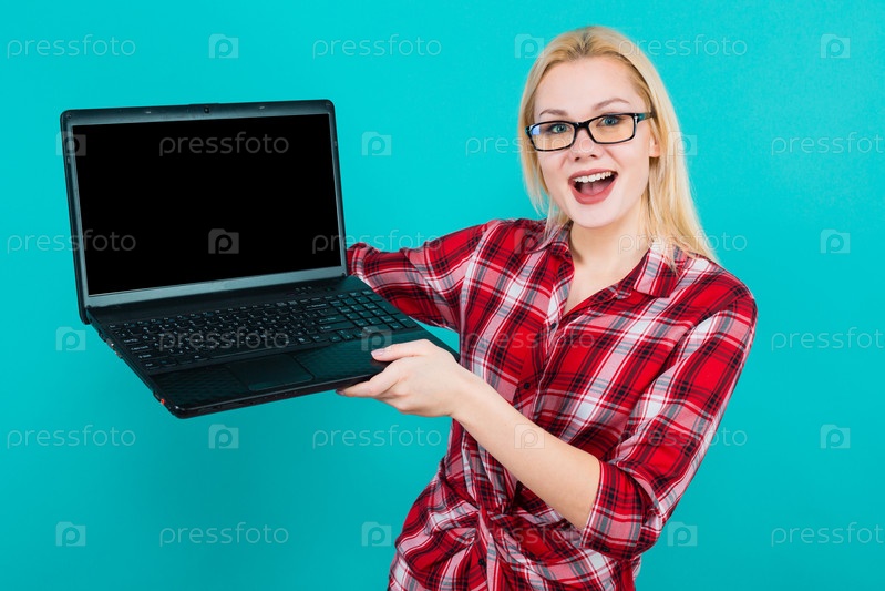 Портрет привлекательной удивленной блондинки в очках в красной клетчатой рубашке на синем фоне, представляющей концепцию рекламы ноутбука