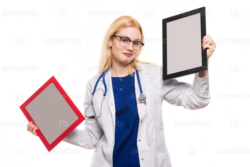 Портрет женщины-врача в белом халате носит стетоскоп и очки, изолированные на белом фоне с копирайтом, держит две пустые рамки