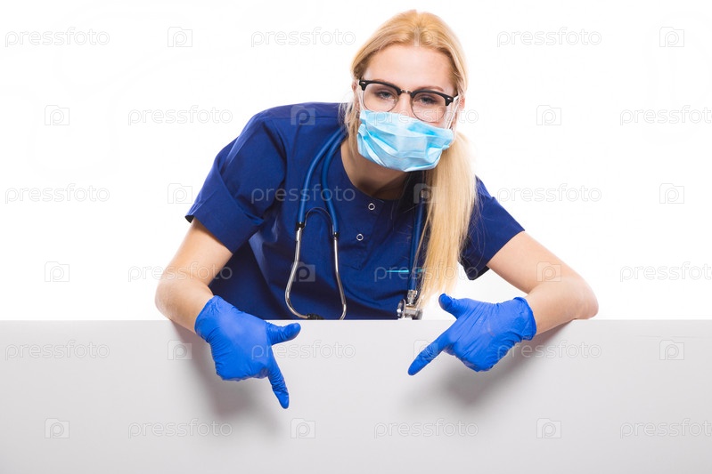 Женщина-врач или хирург в синих халатах, латексных перчатках и маске для лица со стетоскопом, ее пальцы где-то изолированы на белом фоне с рекламной концепцией copyspace