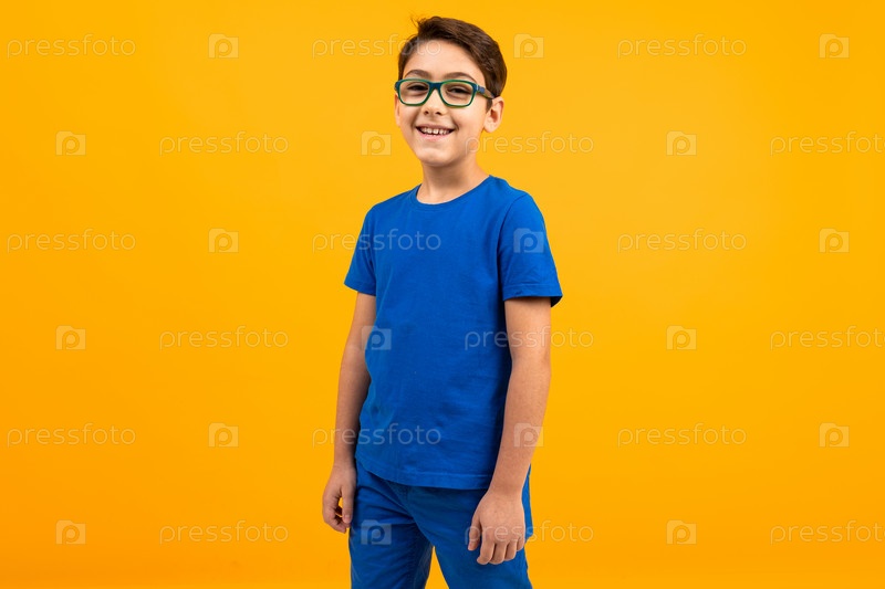 Улыбающийся подросток в синей футболке с руками по швам на желтом фоне с копией пространства