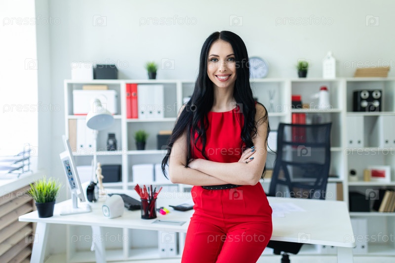 Красивая молодая девушка в красном костюме стоит в офисе, опираясь на стол