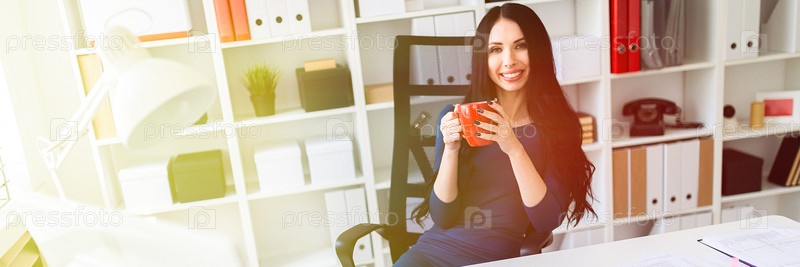 Молодая девушка сидит в офисе за столом и держит в руках красную чашку