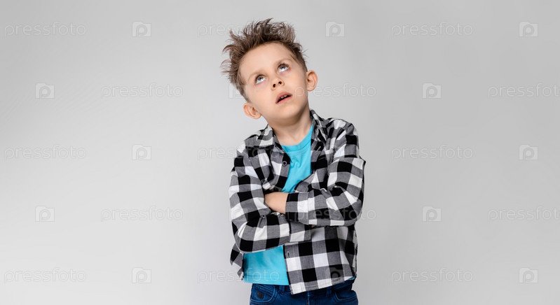 Красивый мальчик в клетчатой рубашке, синей рубашке и джинсах стоит на сером фоне. Мальчик скрестил руки на груди. Мальчик закрыл глаза
