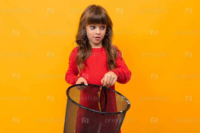 Привлекательная девушка бросает очки для зрения в мусорное ведро на оранжевом фоне
