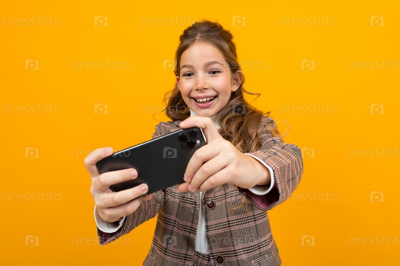 Смеющаяся стильная блондинка в классической куртке играет в игры на смартфоне на желтом студийном фоне