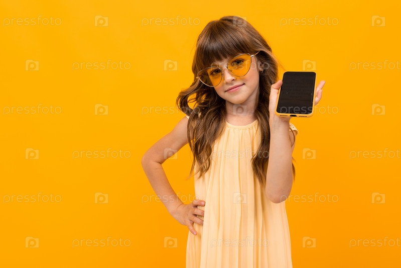 Красивая маленькая девочка в платье держит телефон на желтом и оранжевом фоне