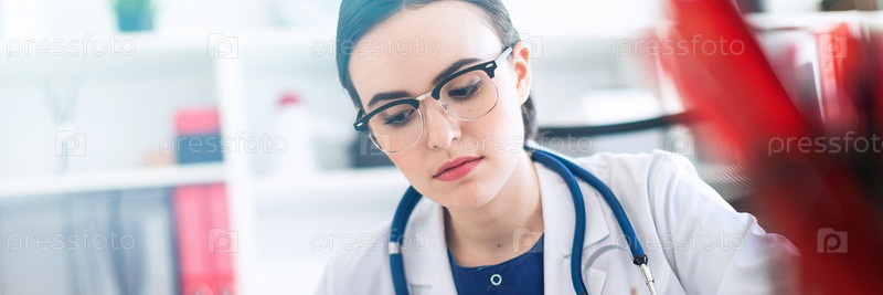 В кабинете сидит очаровательная молодая девушка в очках, синей блузке и белом халате. У девушки на шее стетоскоп. фото с глубиной резкости