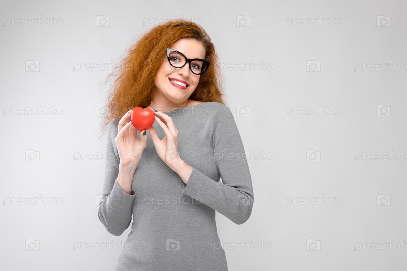 Портрет красивой рыжеволосой счастливой улыбающейся молодой женщины в серой одежде в очках с красным сердцем в качестве концепции здравоохранения на сером фоне
