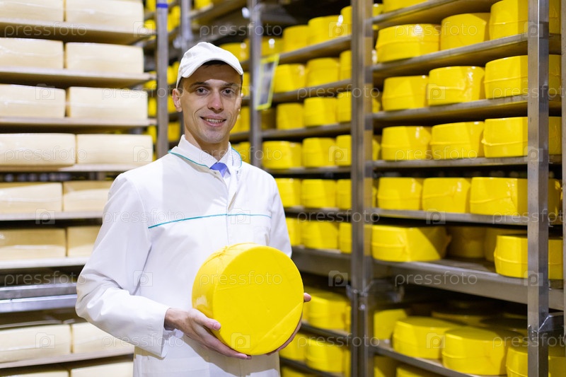 Мужчина в белом халате с головкой сыра в руках находится на складе сыра