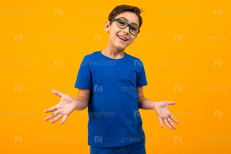 Красивый мальчик-подросток в синей футболке в очках протягивает руки в разные стороны на желтом фоне с копией пространства