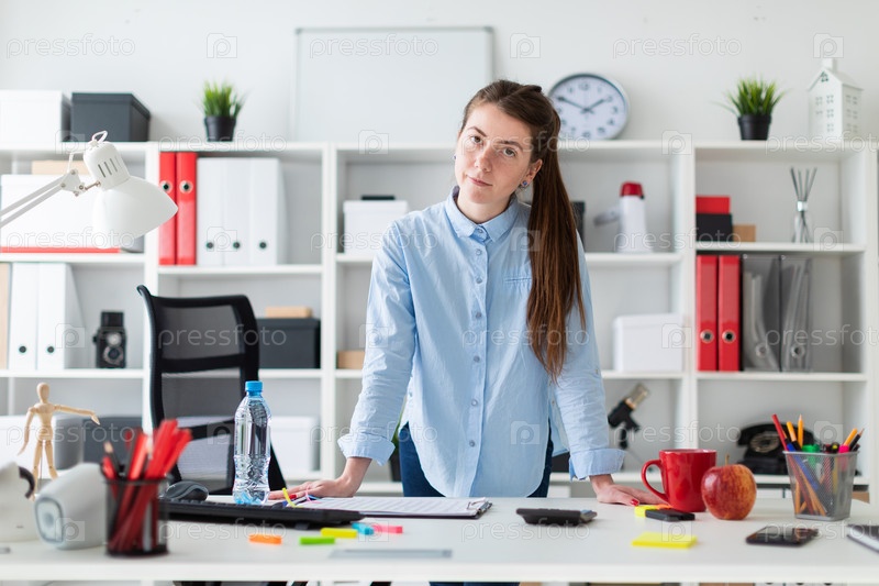 Молодая девушка в офисе стоит возле стола и кладет на него руки