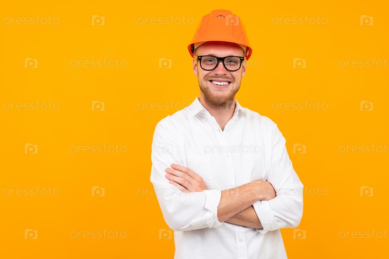 Красивый кавказский инженер в очках и оранжевом шлеме на желтом фоне