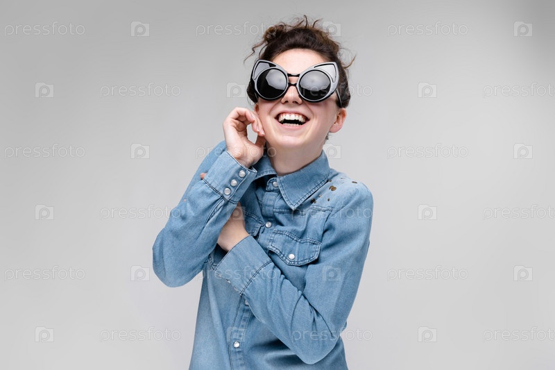 Молодая брюнетка в черных очках. Кошачьи очки. Волосы собраны в пучок. Девушка приложила палец к щеке. Девушка смеется