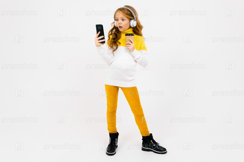 Милая молодая девушка в белых наушниках смотрит на телефон и держит стакан на белом фоне