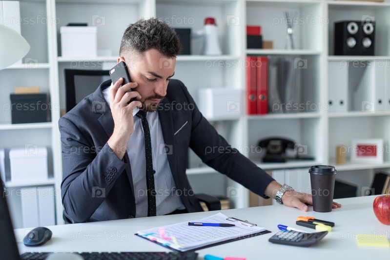 Мужчина сидит за столом в офисе, разговаривает по телефону и держит стакан кофе
