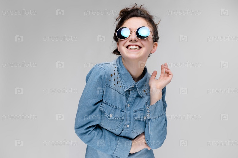 Молодая брюнетка в круглых очках. Волосы собраны в пучок. Девушка танцует