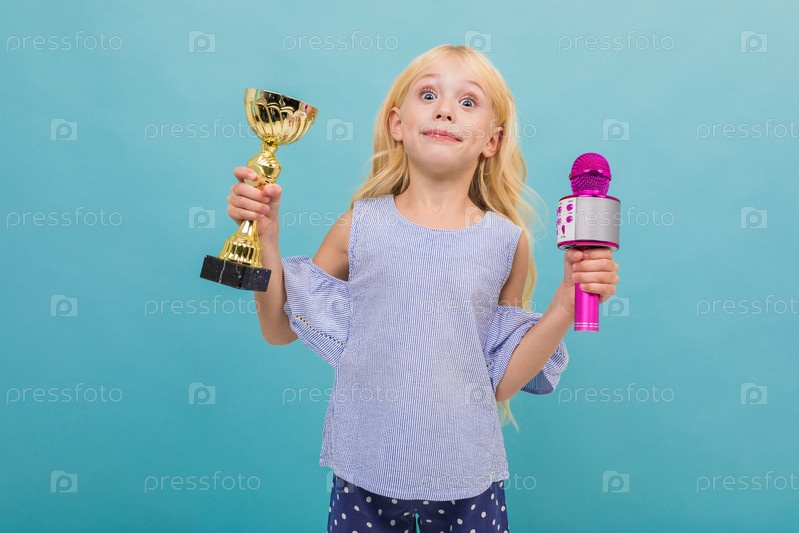 Портрет маленькой кавказской девушки в синей футболке с длинными светлыми волосами держит золотую чашку и микрофон на синем фоне