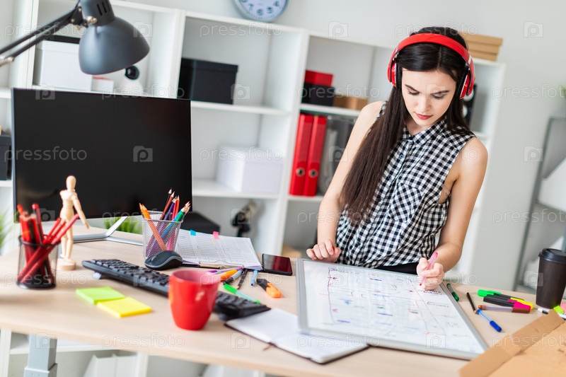 Молодая девушка стоит возле стола и держит маркер в левой руке. На столе магнитная доска