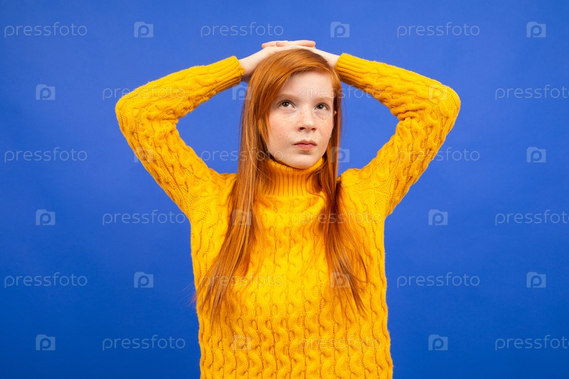 Европейская рыжеволосая девочка-подросток в желтом свитере задумчиво стоит и держит руки за головой на синем фоне студии