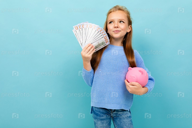 Привлекательная европейская девушка держит копилку и деньги в руках на голубом фоне
