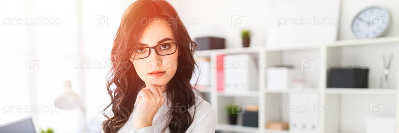 Красивая молодая девушка опирается рукой на подбородок и стоит возле офисного стола