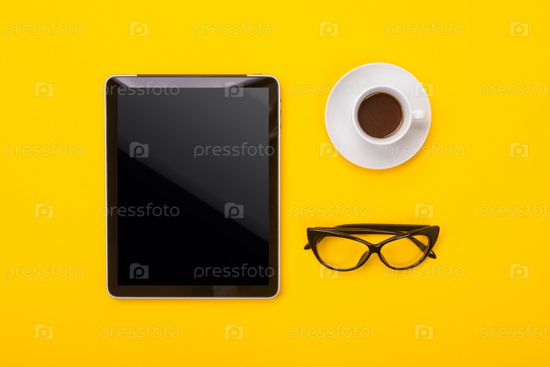 Кофейная чашка, планшет и очки на желтом фоне