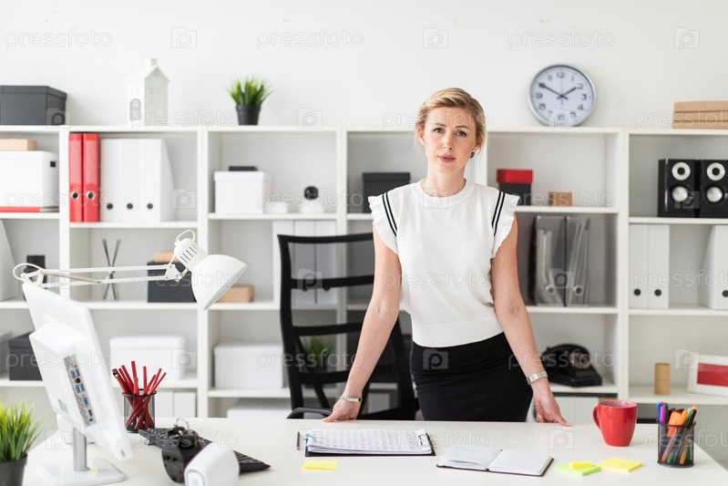 Молодая блондинка стоит возле стола в офисе